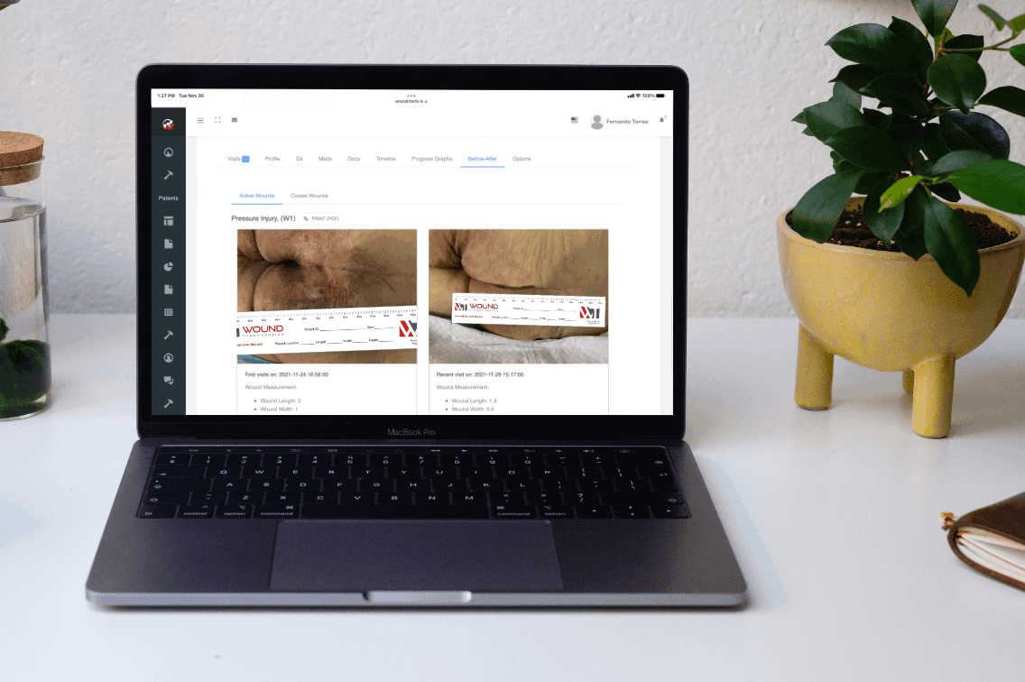 The initial wound photo will always be compared with the last one, including the wound characteristics and treatments. You will be able to download the comparison in a clean PDF report as well.